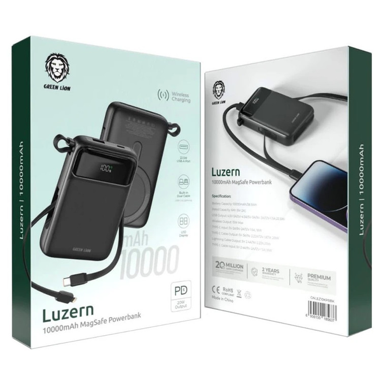 پاوربانک 10000 مگ سیف لوسرن گرین لاین همراه کابل تایپ سی و لایتنینگ دارای ابعاد 106.2x71.5x19.4 میلی متر و وزن فقط 185 گرم تولید شده است که آن را به شارژر همراهی خوش دست و قابل حمل تبدیل کرده است. ظرفیت واقعی باتری این کالا 6000mAh می باشد و جنس این محصول از PC و ABC است و با این پاوربانک سبک وزن می توان هم موبایل را با کابل شارژ کرد و هم موبایل های دارای قابلیت شارژ بی سیم را به صورت وایرلس شارژ کرد، این پاوربانک به آهنربای نئودیمیوم فوق العاده قوی مجهز شده است که به دستگاه شما محکم می چسبد و می تواند هم موبایل را با کابل شارژ کند و هم موبایل هایی که دارای قابلیت شارژ بی سیم هستند رو به صورت وایرلس شارژ کند، همین طور این دستگاه دارای ویژگی آهنربایی یا مگ سیف برای موبایل های آیفون 12 به بالا است و آن ها را در این حالت شارژ می کند. لازم به ذکر است که این محصول دارای درگاه Type-C می باشد و ولتاژ و شدت جریان ورودی آن که برای شارژ کردن این کالا مناسب است، 5V/3.0A بوده و این نکته مهم است که با شارژر مناسب آن را شارژ کنید که با این ورودی ها متناسب باشد. توان خروجی شارژ وایرلس آن تا حداکثر 15 وات و توان خروجی درگاه USB-A آن تا حداکثر 22.5 وات است.