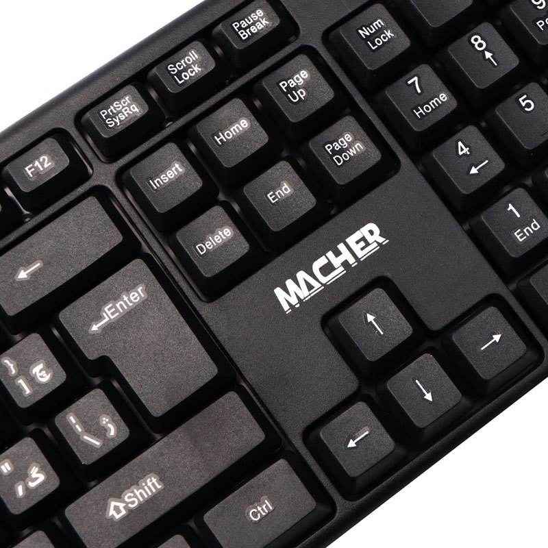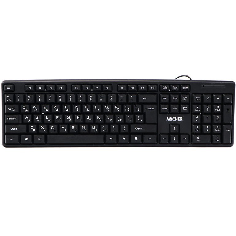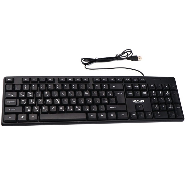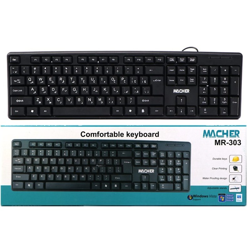 کیبورد Macher MR-303 از طراحی مناسب و ارگونومیک برخوردار بوده که در استفاده طولانی مدت کاربر را دچار خستگی نخواهد کرد، صفحه کلید این کیبورد نیز به دلیل ساختار با کیفیت مقاومت خوبی در برابر گرد و خاک و رطوبت را دارد. این کیبورد با صفحه تخت و کلید های نرم، دارای سرعت عملکرد بالا و بسیار کم صدا بوده و مناسب تایپیست ها و کسانی که زیاد با کیبورد سر و کار دارند می باشد. کیبورد MR-303 دارای ۱۰۴ عدد کلید می باشد که بر روی آنها حروف به دو زبان فارسی و انگلیسی چاپ شده اند و با برخورداری از ماندگاری بالا، به سرعت دچار رنگ پریدگی و محوشدگی نخواهند شد. این کیبورد باسیم، دارای یک کابل ۱٫۵ متری و پایه های خم شونده می باشد، که به کمک آن ها می توان ارتفاع کیبورد را تنظیم نمود. این محصول با رابط USB به کامپیوتر متصل شده و با سیستم عامل های لینوکس، مکینتاش، ویندوزهای ویستا، اکس پی، ۷، ۸ و ۱۰ سازگار می باشد.